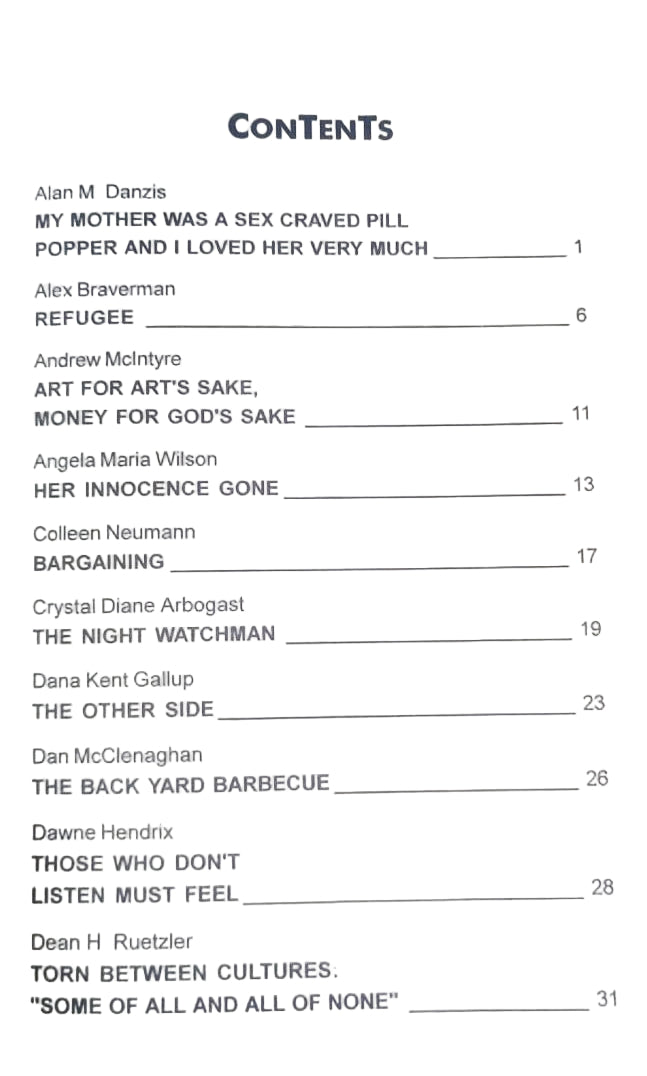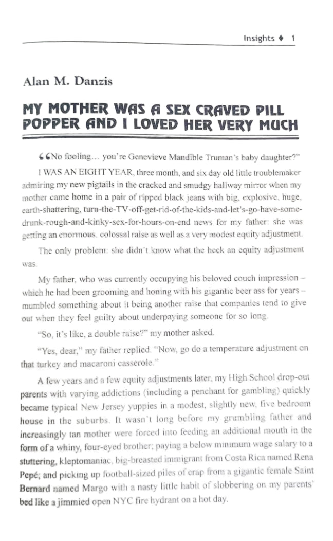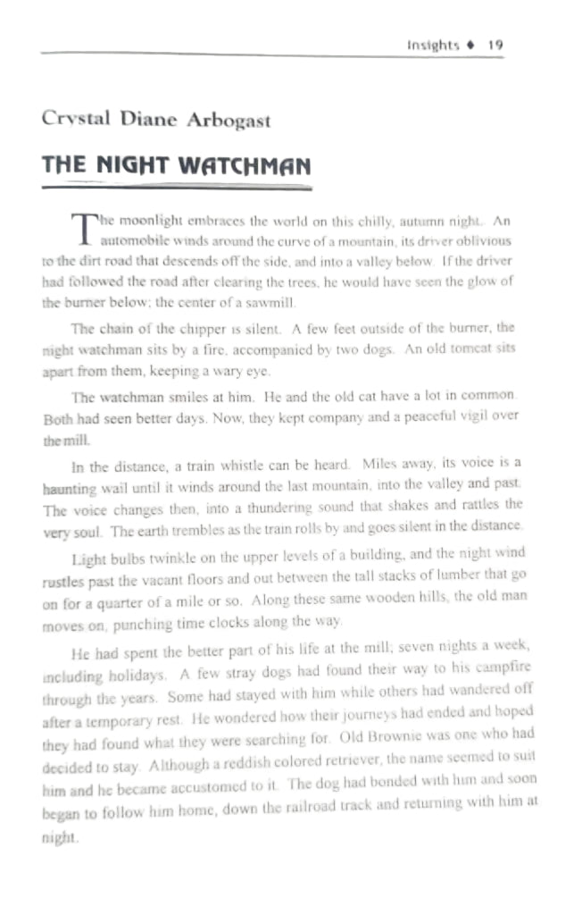 Insights features stories of a great variety. Several of the authors included in Insights reveal in their short stories the impact of John Collier's "Bottle Party" (1939), Elizabeth Bowen's "The Demon Lover" (1941), Saki's "Tobermory" (1911), Isak Dinesen's "The Sailor-Boy's Tale" (1942), E. B. White's "The Door" (1939), E. M. Forster's "The Celestial Omnibus" (1908), Nadine Gordimer's "Termitary" (1974), Hemingway's "In Another Country" (1927), Margaret Atwood's "Significant Moments in the Life of My Mother" (1983), Faulkner's "A
