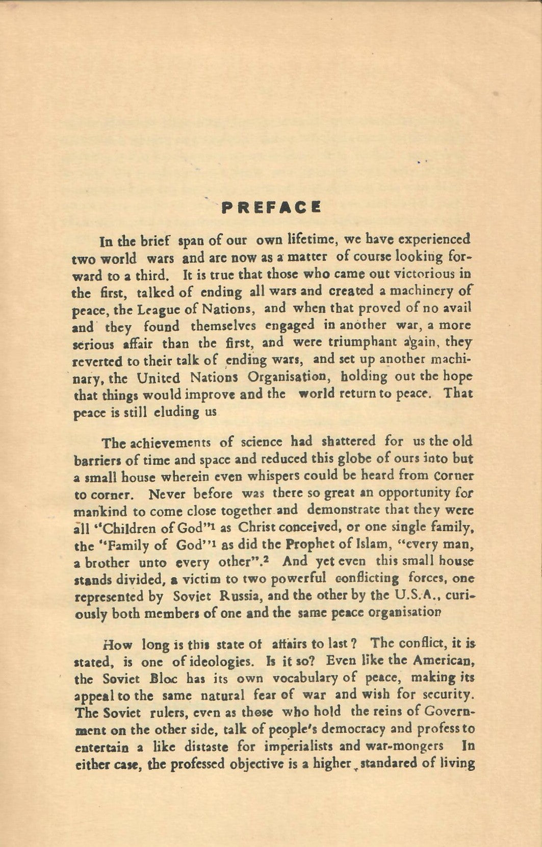 The achievements of science had shattered for us the old barriers of time and space and reduced this globe of ours into but a small house wherein even whispers could be heard from corner to corner. Never before was there so great an opportunity for mankind to come close together and demonstrate that they were all "Children of God" as Christ conceived, or one single family, the "Family of God" as did the Prophet of Islam, "every man, a brother unto every other".2 And yet even this small house stands divided, a victim to two powerful conflicting forces, one represented by Soviet Russia, and the other by the U.S.A., curi-ously both members of one and the same peace organisation