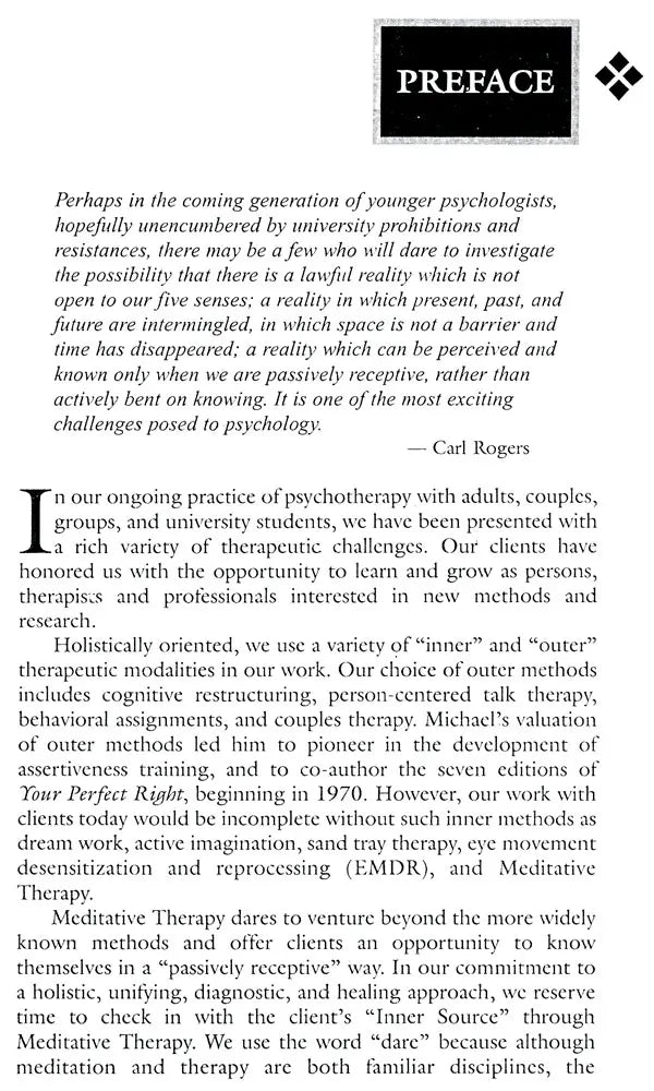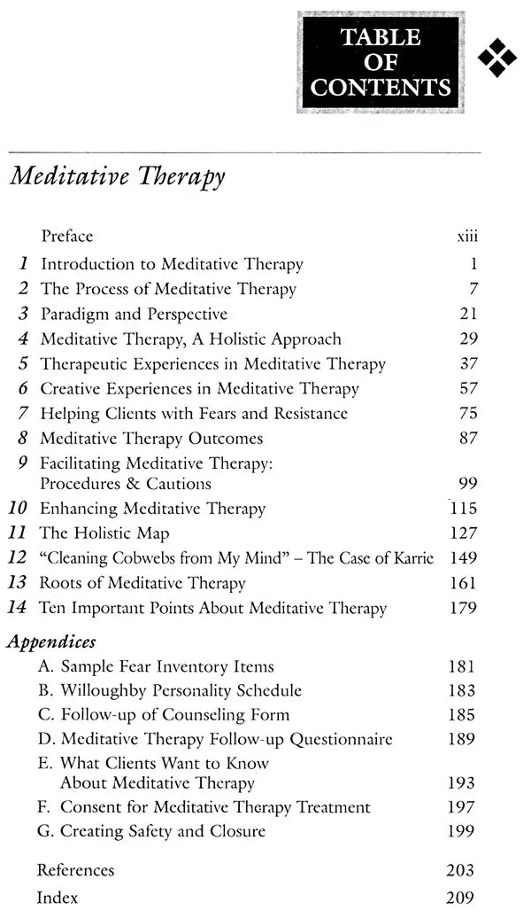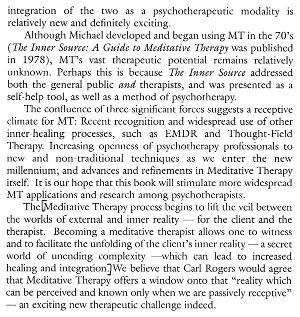 Meditative Therapy: Facilitating Inner Directed Healing by Michael L. Emmons and Janet Emmons is a comprehensive guide to using meditation as a therapeutic tool for healing and personal transformation.
