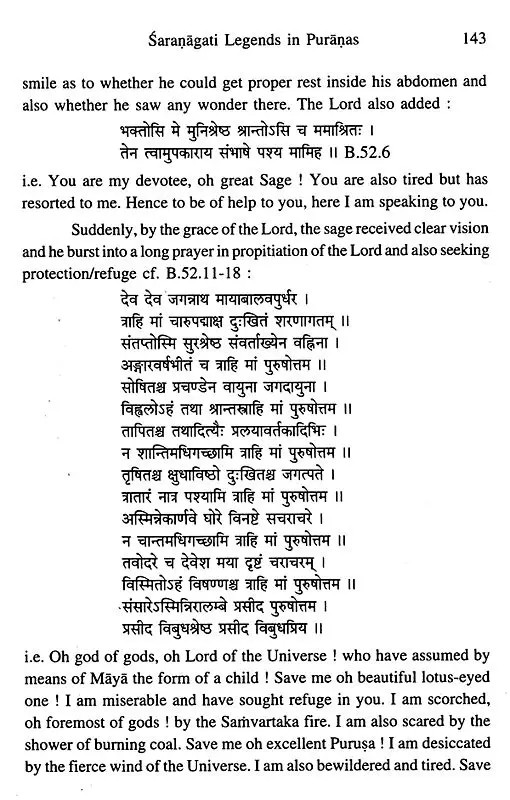 Whereas it is only four or five of the Saranagati -Legends which have become popular, such as that of Prahlada, Dhruva, Gajendramoksa, Kaliya and Kakasura, the present work provides an exhausted list of the legends collected from the Major Puranas. Altogether there are thirty three legends (Vaisnava - 24; Saiva - 8 and Saba - 1) of Saranagati- import presented in this. work. While dealing with every legend attempt has been made to exhaustively quote the original verses of Saranagati-import which would help the reader arrive at his own assessment of the material. The verses thus quoted are either preceded or immediately followed with an English translation.