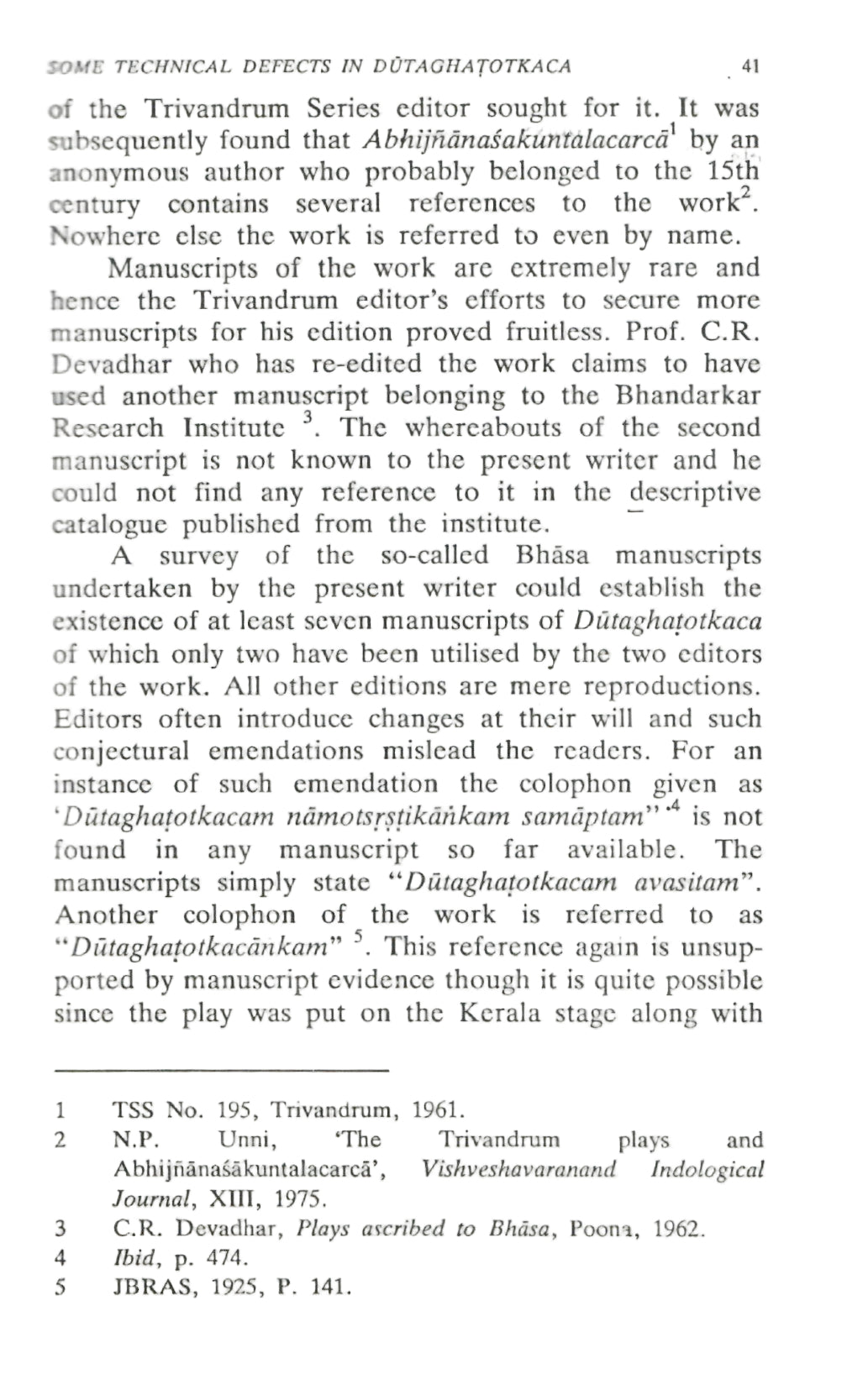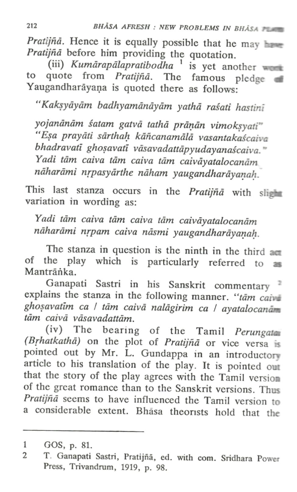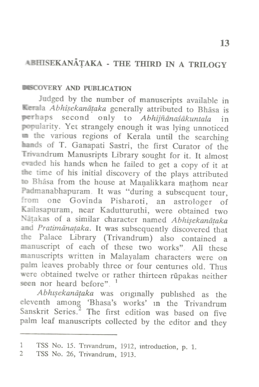 "Would you please show me the Bhasa manuscripts? a slender good looking girl greeted me with this question when I stepped out of the Sanskrit College, Trivandrum, on a quiet evening in 1967I had just finished my class on Pratimanataka and was really under the spell of the Bhasa play when this question confronted me. I looked at her inquisitive face and felt a little embarrassed. In spite of the close proximity of the Bhasa texts which were kept in the next-door Kerala University Oriental Manuscripts Library, I had not cared to have even a glance at them for all these long years. That Bengali girl, Radha Rani Sengupta, if I remember her name correctly, is the one person responsible for my enquiry into the Bhasa problem based on the Bhasa manuscripts.