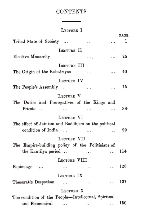 This book contains the tribal state of society, elective monarchy, the origin of Kshatriyas, the people's assembly, the duties and prerogatives of the kings and priests, the effect of Jainism and Buddhism on the political condition of India, the empire-building policy of the politicians of the Kautilya period, espionage, theoretic depotism, the condition of the people -intellectual, spiritual and economical. In the last three appendices he has dealt with election of kings and delegation of sovereignty, sacrificial fasting as a form of passive resistance and state-ownership land.