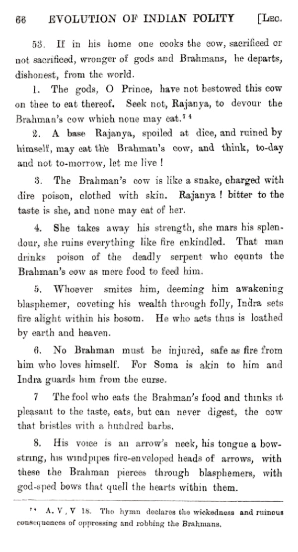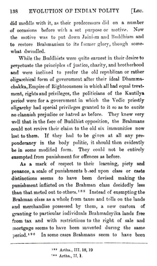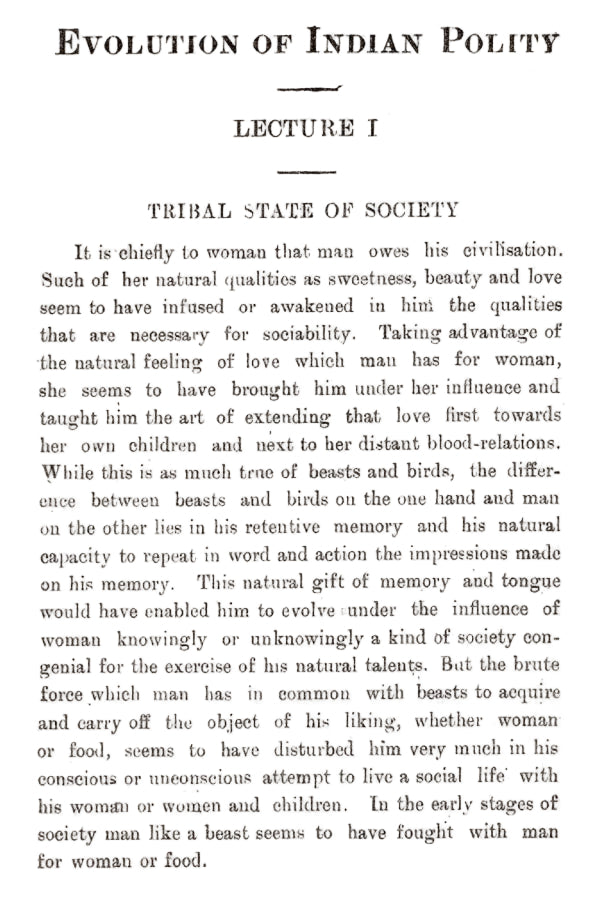 This book contains the series of ten lectures delivered by me on the "Evolution of Indian Polity" under the Presidency of the Hon. Dr. Sir Asutosh Mookerjee, President of the Council of the Post-Graduate Studies in Arts at the Calcutta University in the months of March and April 1919. The first stage in the evolution, as detailed in the first lecture, is found universal and as such it requires no additional proof. The Institution of Elective Monarchy of Bachelor kings begotten by priests on a family of queens or cows as they are called, is peculiar to India; and no other nation has as yet been found to have passed through the institution of bachelor kings to hereditary monarchy which forms the third stage in the evolution of Indian polity. In all these stages, the monarchical element seems to have been under the powers of the Peoples' Assembly composed of priests, nobles (Rajas), traders and Agriculturists (Vis). As stated in the Mimansa Sutras of Jaimini, the king had no power over laud, and was entitled only to 4th of the produce.' Banishment or degradation of kings was one of the constitutional checks frequently employed for the prevention of the kings' extravagant proceedings and gambling and other vices.2 The same constitutional check seems to have been employed even in the few Buddhist republics that prevailed side by side with monarchical institutions. What strikingly distinguishes India from the other contemporary nations in the application of such constitutional checks as banishment or degradation of tyrannical kings is its calm and peaceful procedure as contrasted with the bloody revolutions accompanied with horrible destruction of person and property in other nations. It is Atmamedha, also called prayopavesa or the vow of abstinence to death on the part of the people en masse¹ till the removal of the cause of their grievances.