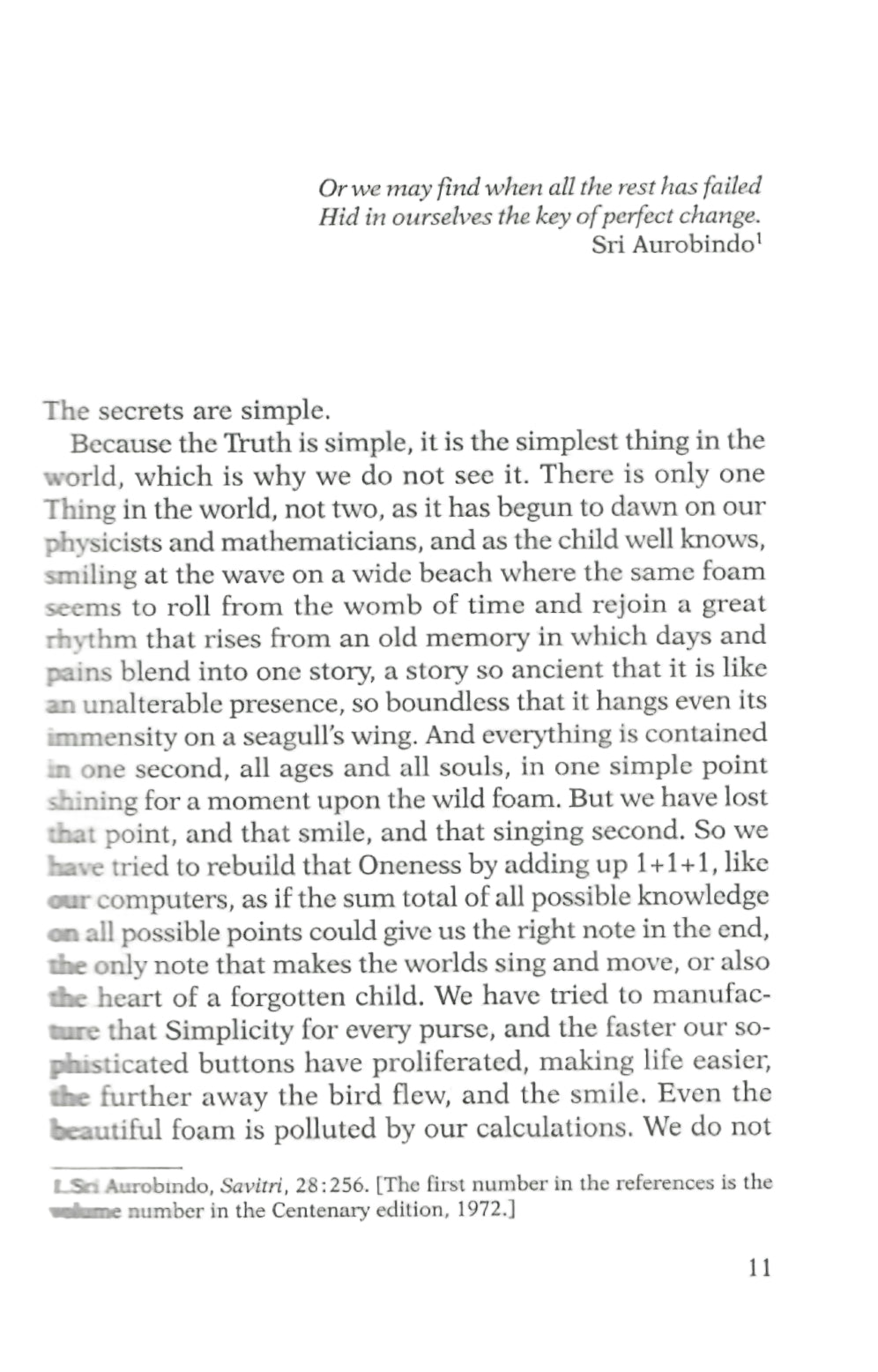 Because the Truth is simple, it is the simplest thing in the world, which is why we do not see it. There is only one Thing in the world, not two, as it has begun to dawn on our physicists and mathematicians, and as the child well knows, smiling at the wave on a wide beach where the same foam seems to roll from the womb of time and rejoin a great rhythm that rises from an old memory in which days and pains blend into one story, a story so ancient that it is like an unalterable presence, so boundless that it hangs even its immensity on a seagull's wing. And everything is contained in one second, all ages and all souls, in one simple point shining for a moment upon the wild foam. But we have lost that point, and that smile, and that singing second. So we have tried to rebuild that Oneness by adding up 1+1+1, like our computers, as if the sum total of all possible knowledge on all possible points could give us the right note in the end, the only note that makes the worlds sing and move, or also the heart of a forgotten child. We have tried to manufac-ture that Simplicity for every purse, and the faster our so-phisticated buttons have proliferated, making life easier, the further away the bird flew, and the smile. Even the beautiful foam is polluted by our calculations. We do not