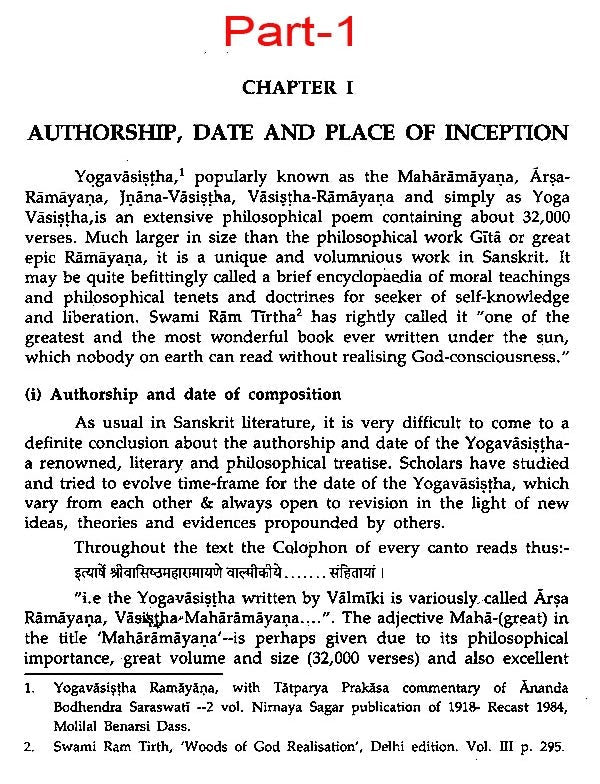 To facilitate its study, the entire Sanskrit text of the Yogavasiṣṭha (32,000 verses) with Tatparya prakāśa Commentary' written by 'Bodhendra Saraswati' along with a brief introduction in 3 volumes. The first volume comprises of (i) Introduction of Yogavāsiṣṭha (divided into six chapters); and (ii) Text and commentary of Vairagya, Mumuksu, Utpatti and Stithi Prakaranas; The second volume contains the text & commentary of upaśama and Purvärdha of Nirvana Prakarana; Whereas the 3rd volume has (i) Text with commentary of Uttaradha of Nirvana Prakarana, (ii) Ślokānupramaṇikā and (iii) Metrical Analysis of the Yogavāsiṣṭha.