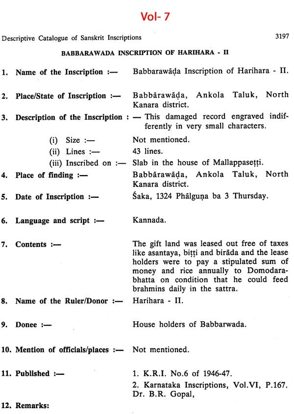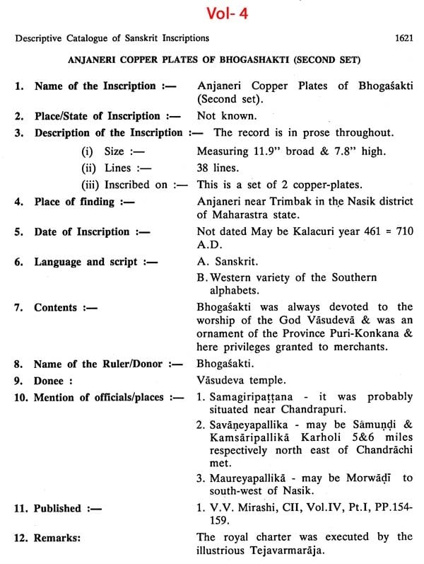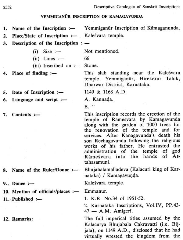 The Descriptive Catalogue presents a detailed study of Sanskrit inscriptions numbering in thousands and found in whole of India, Nepal, Pakistan and Afganistan. The Catalogue' is a result of dedicated study and research of more than ten years and presents a clear and com prehensive picture of inscriptions right from 300 B.C. to 19th century A.D. It gives the vital and necessary formation and con tents of each inscription. It indicates its present position, language, script, time of composition, socio-economic and political importance.