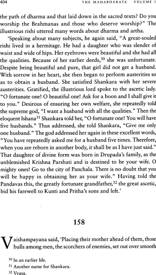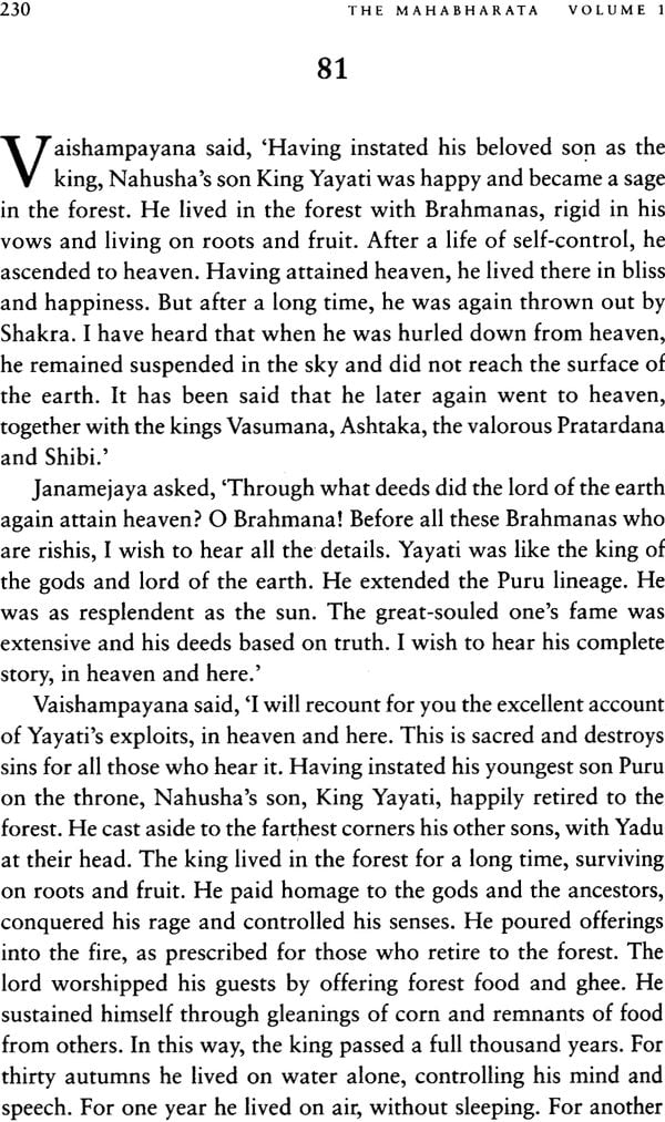 Volume 1 consists of most of Adi Parva, in which much happens before the Kauravas and the Pandavas actually arrive on the scene. This volume covers the origins of the Kuru clan; the stories pouchy, Poutama and Astika; the births of Kauravas and the Pandavas; the house of lac; the salaying of Hidimba and Baka; Draupadi’s marriage; and ends with the Pandavas obtaining their share of the kingdom.