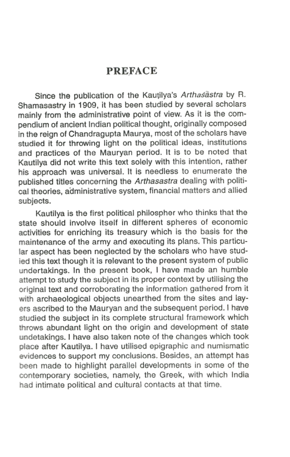 Kautilya is the first political philospher who thinks that the state should involve itself in different spheres of economic activities for enriching its treasury which is the basis for the maintenance of the army and executing its plans. This particular aspect has been neglected by the scholars who have studied this text though it is relevant to the present system of public undertakings. In the present book, I have made an humble attempt to study the subject in its proper context by utilising the original text and corroborating the information gathered from it with archaeological objects unearthed from the sites and lay-ers ascribed to the Mauryan and the subsequent period. I have studied the subject in its complete structural framework which throws abundant light on the origin and development of state undertakings. I have also taken note of the changes which took place after Kautilya. I have utilised epigraphic and numismatic evidences to support my conclusions. Besides, an attempt has been made to highlight parallel developments in some of the contemporary societies, namely, the Greek, with which India had intimate political and cultural contacts at that time.