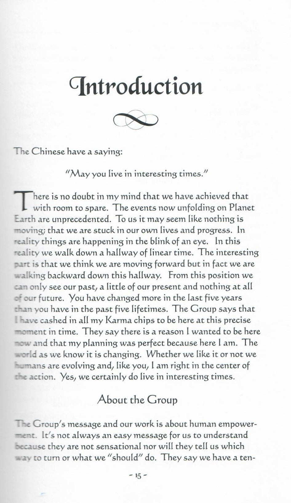T here is no doubt in my mind that we have achieved that with room to spare. The events now unfolding on Planet Earth are unprecedented. To us it may seem like nothing is moving; that we are stuck in our own lives and progress. In reality things are happening in the blink of an eye. In this reality we walk down a hallway of linear time. The interesting part is that we think we are moving forward but in fact we are walking backward down this hallway. From this position we can only see our past, a little of our present and nothing at all of our future. You have changed more in the last five years than you have in the past five lifetimes. The Group says that I have cashed in all my Karma chips to be here at this precise moment in time. They say there is a reason I wanted to be here now and that my planning was perfect because here I am. The world as we know it is changing. Whether we like it or not we humans are evolving and, like you, I am right in the center of the action. Yes, we certainly do live in interesting times.
