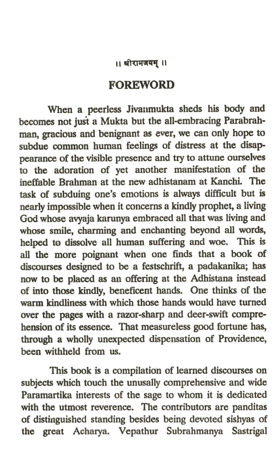 When a peerless Jivanmukta sheds his body and becomes not just a Mukta but the all-embracing Parabrahman, gracious and benignant as ever, we can only hope to subdue common human feelings of distress at the disappearance of the visible presence and try to attune ourselves to the adoration of yet another manifestation of the ineffable Brahman at the new adhistanam at Kanchi. The task of subduing one's emotions is always difficult but is nearly impossible when it concerns a kindly prophet, a living God whose avyaja karunya embraced all that was living and whose smile, charming and enchanting beyond all words, helped to dissolve all human suffering and woe. This is all the more poignant when one finds that a book of discourses designed to be a festschrift, a padakanika; has now to be placed as an offering at the Adhistana instead of into those kindly, beneficent hands. One thinks of the warm kindliness with which those hands would have turned over the pages with a razor-sharp and deer-swift comprehension of its essence. That measureless good fortune has, through a wholly unexpected dispensation of Providence, been withheld from us.