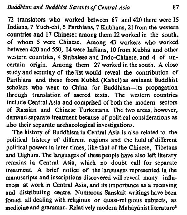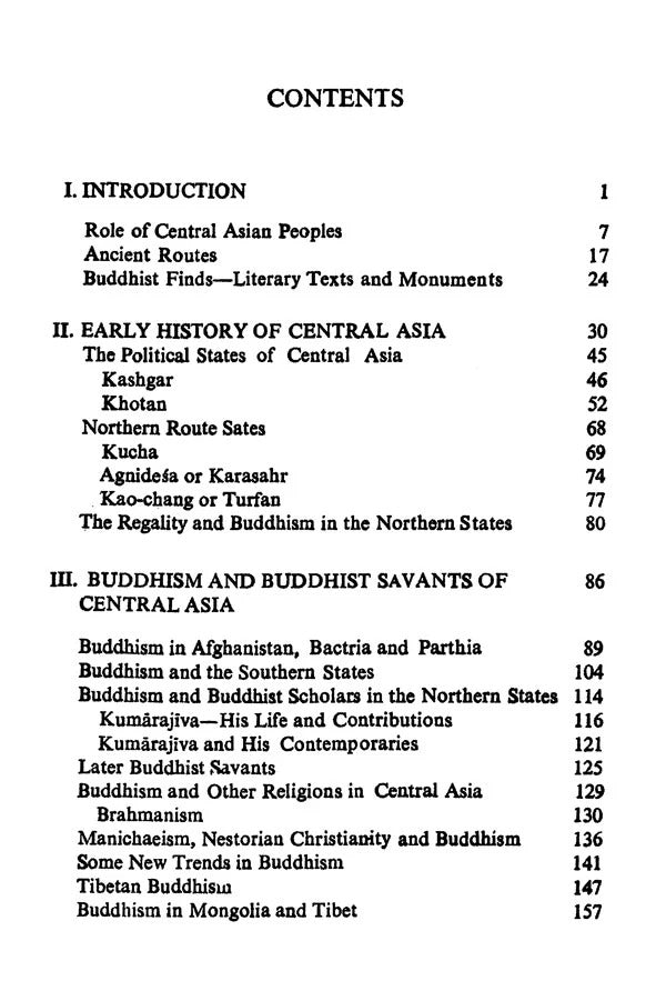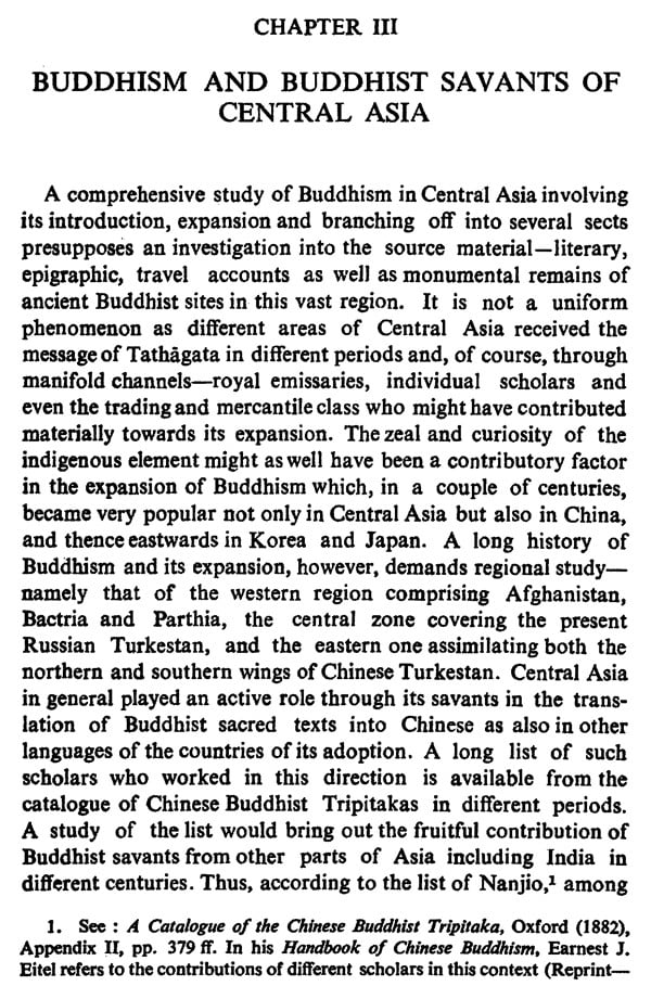 A comprehensive study of Buddhism in Central Asia is thus attempted in this work, taking into account all the factors and forces responsible for its introduction, prosperity, and eventual decay and decline. Nature no doubt provided complete shelter to Buddhist art treasures and polyglot libraries which were sealed off to protect them from vandalists and marauders. These lay enveloped till the spade of explorers and archeologists could reveal the mysterious past of Buddhism in this vast area of the Tarim basin studded with sites and spots which are separated by considerable distances and which were once humming with the spiritual and temporal activities of the people wedded to the religion of the Buddha.