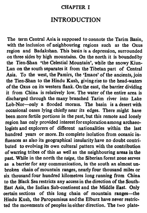 The term Central Asia is supposed to connote the Tarim Basin, with the inclusion of neighboring regions such as the Oxus region and Badakshan. This basin is a depression, surrounded on three sides by high mountains. On the north it is bounded by the Tien-Shan ‘the Celestial Mountain’ while the snowy Kiun-Lun on the south separates it forms the Tibetan part of Central Asia. To the west, the Pamirs, the ‘Imaos’ of the ancients, join the Tien-Shan to the Hindu Kush, giving rise to the head-waters of the Oxus on its western flank. On the east, the barrier dividing it from China is relatively low. The water of the entire area is discharged through the many branched Tarim river into Lake Lob-Nor –only a flooded morass. The basin is a desert with occasional oases lying chiefly near its edges. There might have been more fertile portions in the past, but this remote and lonely region has only provided interest for exploration among archaeologists and explorers of different nationalities with in the last hundred years or more. Its complete isolation from oceanic influences as also its geographical insularity have no doubt contributed to evolving its own cultural pattern with the contribution of warring tribes of this as well as the neighbouring areas in the past. While in the north the taiga, the Siberian forest zone serves as a barrier for any communication, in the south an almost unbroken chain of mountain ranges, nearly four thousand miles or six thousand four hundred kilometers long running from China to the Black Sea restricts any access in the direction of the South-East Asia, the Indian Sub-continent and the mountain ranges –the Hindu Kush the paropamisus and the Elburz have never restricted the movements of peoples in either direction. The two plate-aux–Tibet on the south, enclosed by the Himalayas, and Iran, flanked on the south-east by the Kirthar and Sulaiman ranges, and on the south-west by the Zagros, have provided historical links with Central Asia proper.