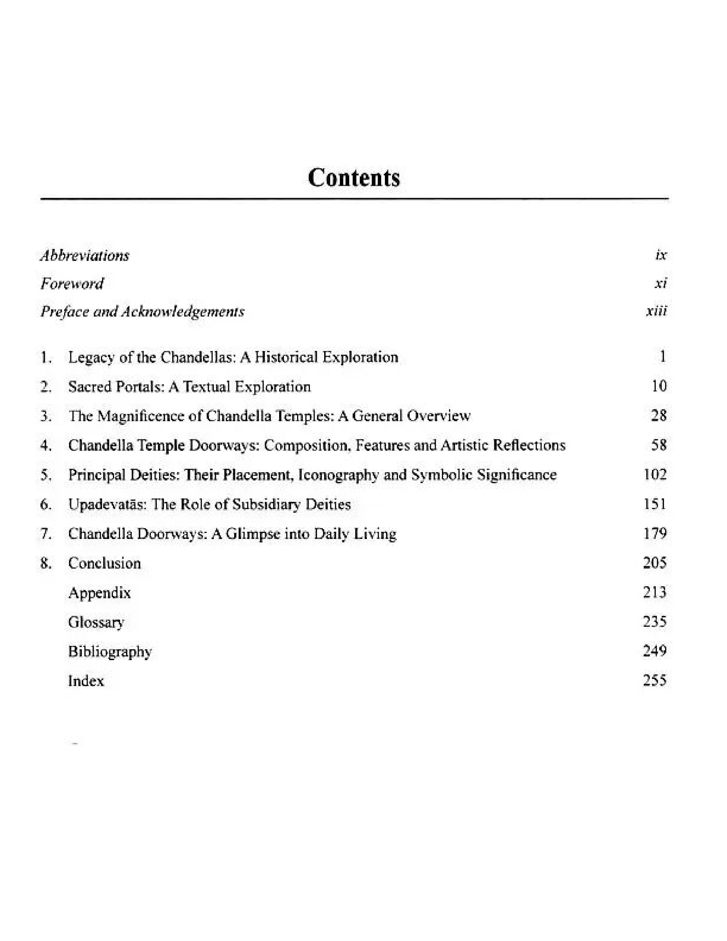 The present research work is a study of sculptures carved on different parts of the doorways, such as the lintel (uttaranga), the door jambs (dv ara-s akh a) and the threshold (udumbara). It is an attempt to throw light on the religious, iconographic, socio-cultural and artistic features and the symbolic significance of figural depictions on different parts of the doorways of the temples built during the period of the Chandella rulers. The period of the Chandellas (9th-12th century C.E.) witnessed the construction of magnificent temples at Khajuraho and Ajayagadh of Madhya Pradesh and Mahoba, Kalanjar, Devagadh, Dudhai, Chandpur, Madanpur and Gairaha of Uttar Pradesh. This study shall cover the temples that have intact doorways that made significant cultural and artistic contributions and the doorway fragments especially lintels which indicate the existence of temples, their dedication and religious significance.