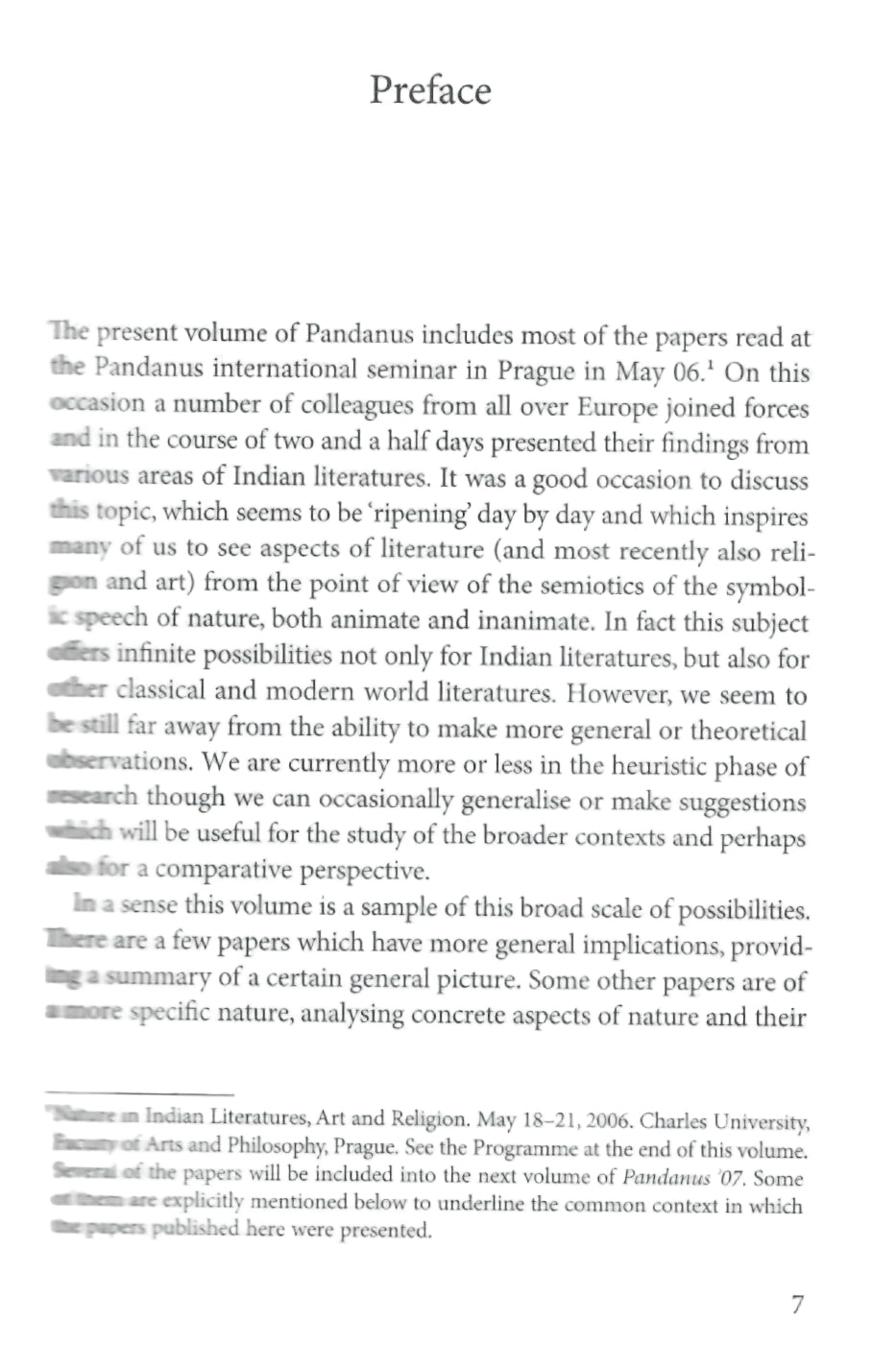 The present volume of Pandanus includes most of the papers read at the Pandanus international seminar in Prague in May 06.¹ on this occasion a number of colleagues from all over Europe joined forces and in the course of two and a half days presented their findings from various areas of Indian literatures. It was a good occasion to discuss this topic, which seems to be 'ripening' day by day and which inspires many of us to see aspects of literature (and most recently also religion and art) from the point of view of the semiotics of the symbol-ac speech of nature, both animate and inanimate. In fact, these subject ferns infinite possibilities not only for Indian literatures, but also for other classical and modern world literatures. However, we seem to be still far away from the ability to make more general or theoretical observations. We are currently more or less in the heuristic phase of research though we can occasionally generalise or make suggestions which will be useful for the study of the broader contexts and perhaps also for a comparative perspective.