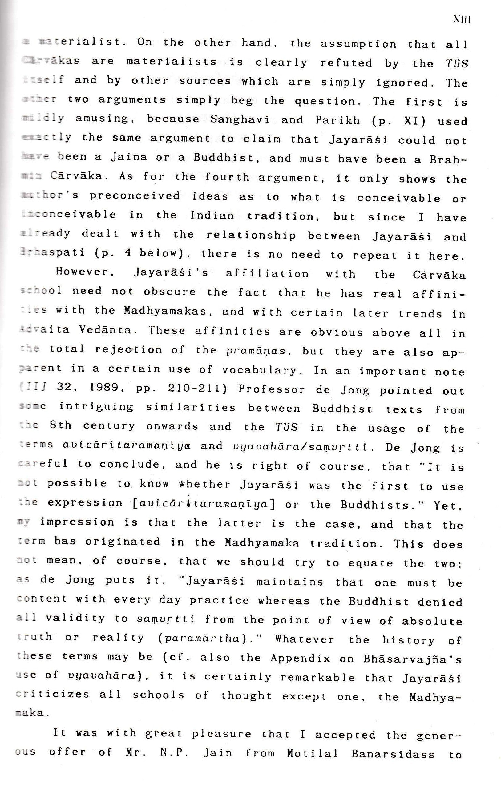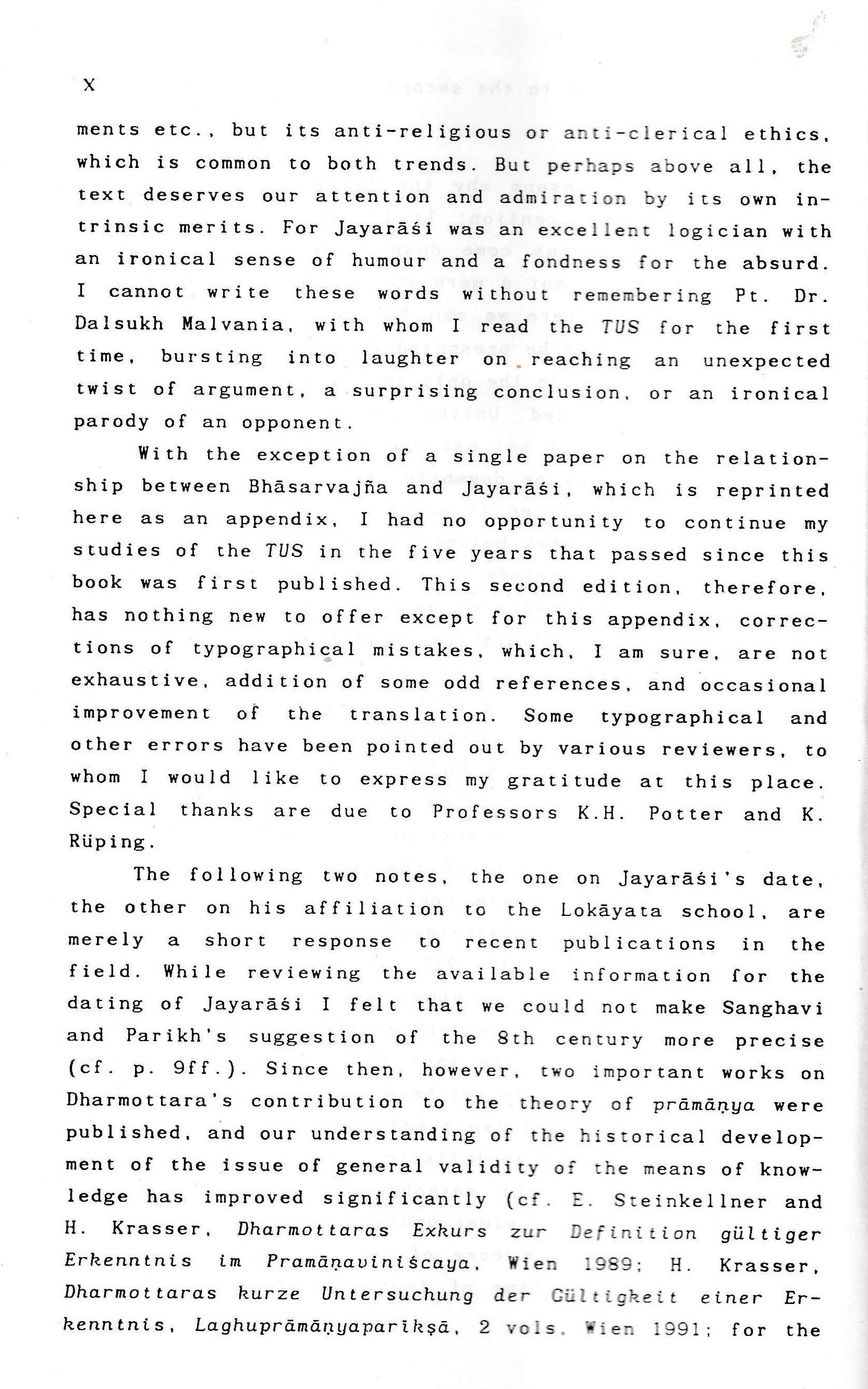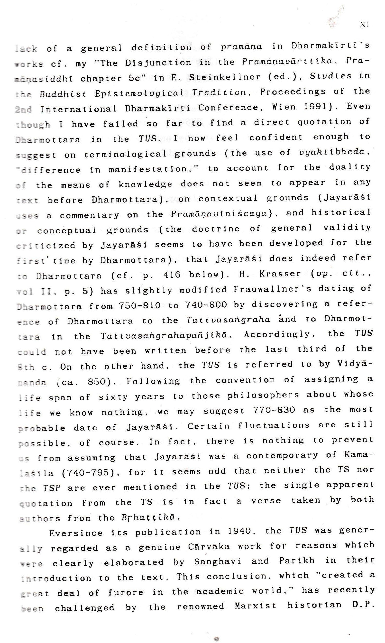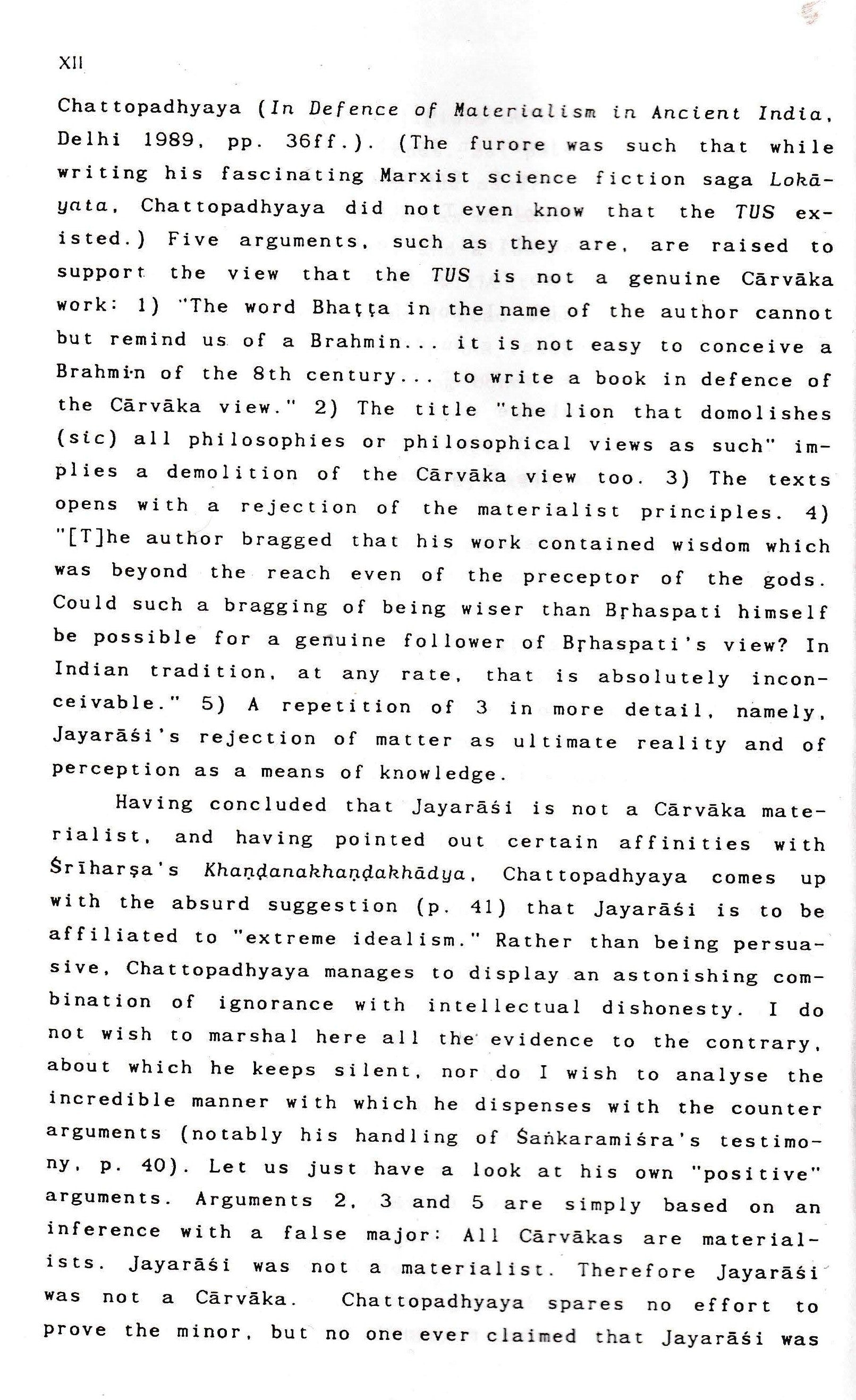 It contains one of the earliest and most devastating criticisms of philosophers like Uddyotakara, Kumārila and Dharmakīrti. Due to its extremely polemical character, highly diversified range of opponents, as well as the mode of criticism which is always accurately directed at a specific target Jayaräsi never criticises a Buddhist or Nyaya position in general, but only as formulated by a specific philosopher in a specific passage the text provides us with an unusually privileged perspective of the philosophical scene in the second half of the 8th century. Occasionally we may even catch a glimpse of doctrines we were completely unaware.
