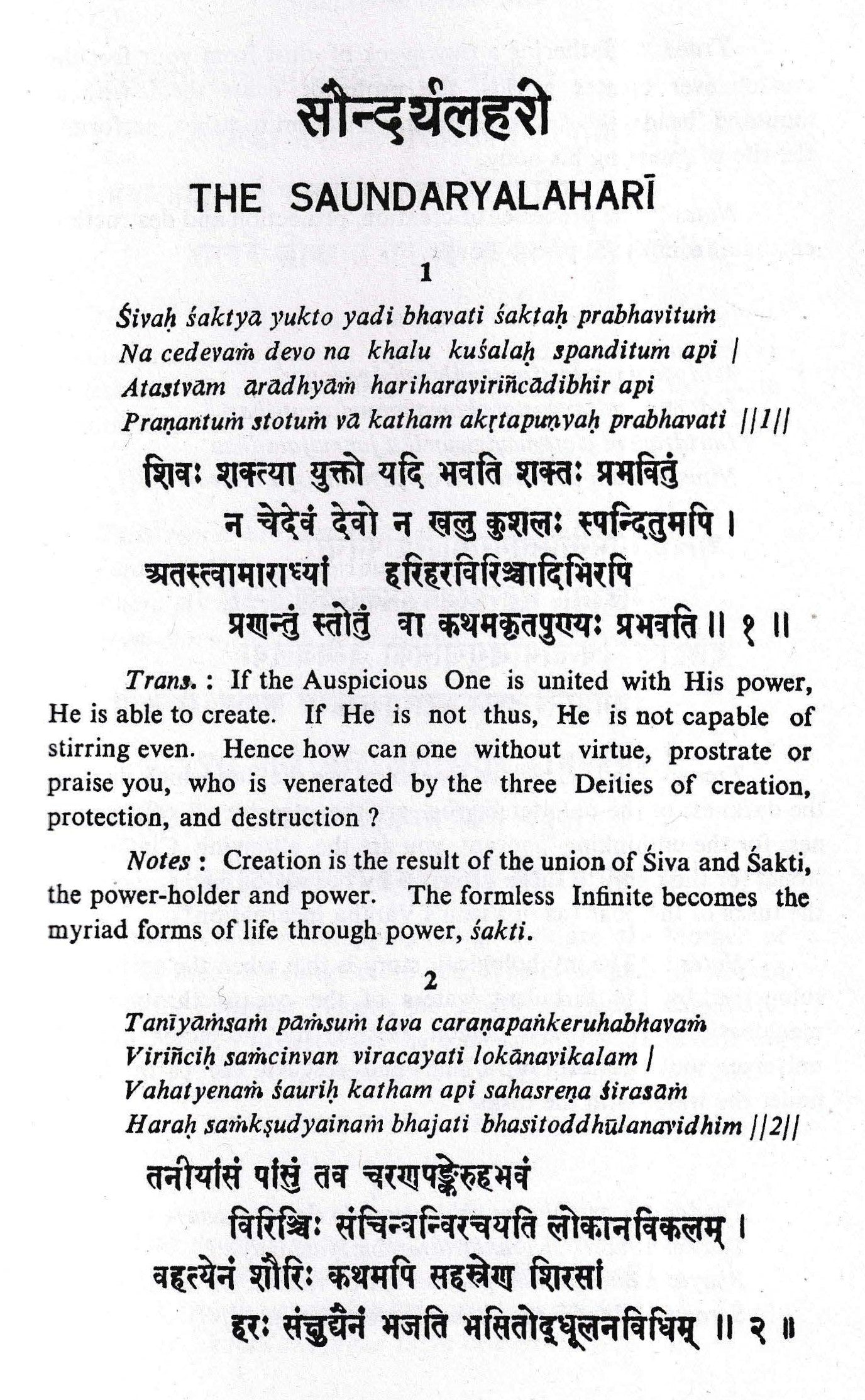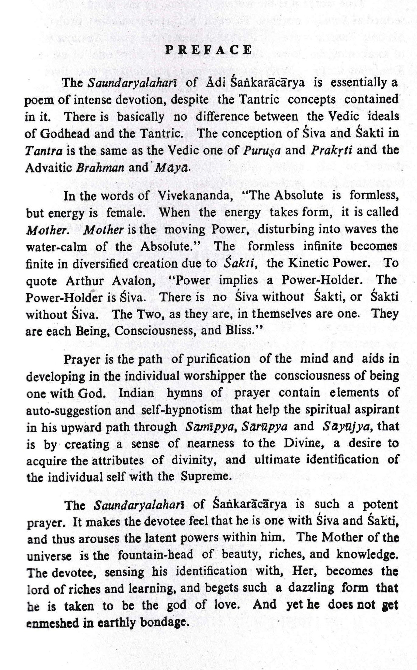 In placing this edition of Saundaryalahari, with English translation, Notes and Yantric diagrams, I invite all the readers thereof to take a holy dip in this ocean of bliss and beauty, bequeathed to us by the Great Master.