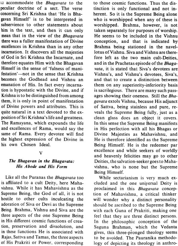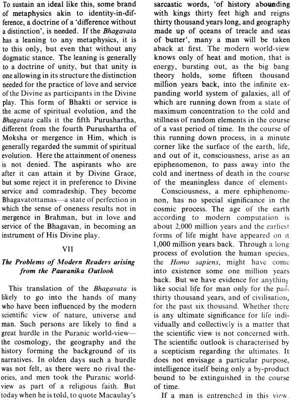 The Introduction seeks to provide considerable background-information required by a modern reader to grasp the methodology and the outlook of Pauranika literature in respect of space, time, Nature and man. There are many more allied themes, like the doctrines of divine love, the theology of the Bhagavata, the doctrines of Incarnations etc., that have to be kept in mind while reading the Text. As their treatment also in the Introduction would make that section too long, some of them are treated in the Prologues to each Skandha, especially in the Prologue to the tenth, and in the Appendix. A close study of them will help in a deeper understand of the Text.