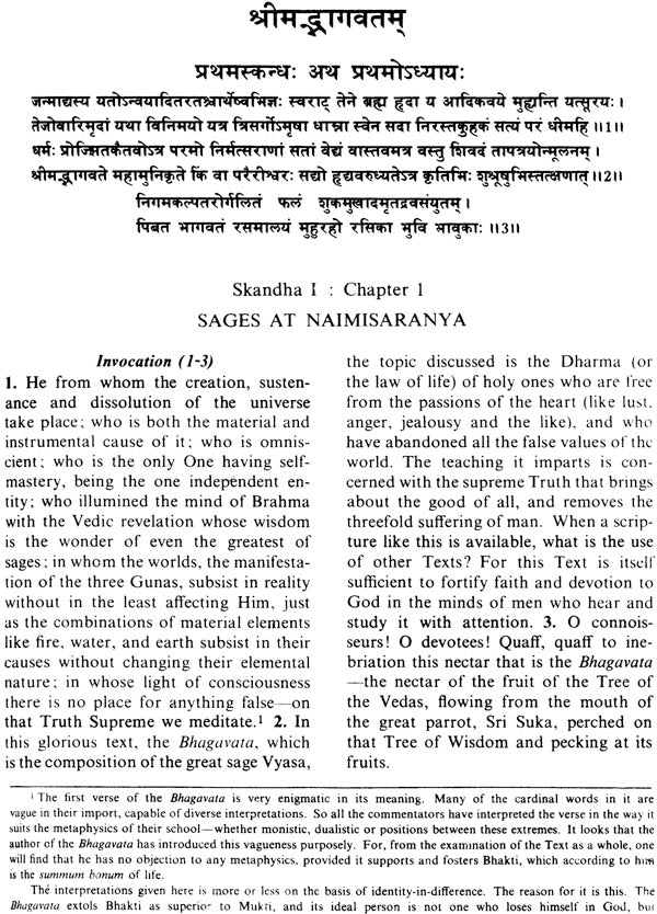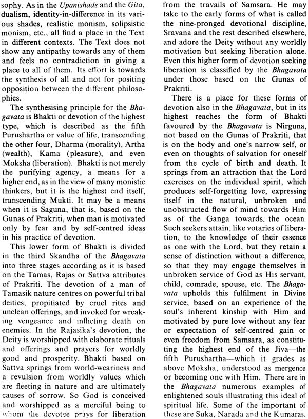 In regard to the metaphysical affiliation of the Bhagavata, it seems that it is not committed to any particular system exclusively. We find in it representation of all strands of metaphysics common in Indian philosophy. The author of the Bhagavata has no objection to any of them, provided the place of Bhakti as the highest value, the fifth Purushartha attainable by man, is not jeopardised, and the God of Love is not endangered by metaphysical subtleties. The translation has kept this in view, and it is in the light of this ideas that the first verse of the Bhagavata, which is the keynote verse of the whole Text, is translated.