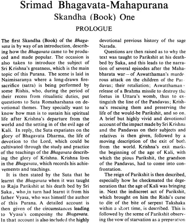 This English translation of Srimad Bhagavata Purana seeks to place before the ordinary reader a fairly lucid rendering of the great Text, verse by verse, without any pretension to very high standards of Sanskrit scholarship. Readability has been given precedence over meticulous accuracy throughout the translation. The Bhagavata is a difficult text, in many places too terse to yield a clear meaning, and in others, so vague that one can draw any meaning that one wants to find. It is also not very respectful to grammatical orthodoxy. It will therefore be easy to find many flaws and inaccuracies in the translation, but if it succeeds in engaging the reader's attention and in conveying the devotional spirit of the Text, it would have succeeded in its object.