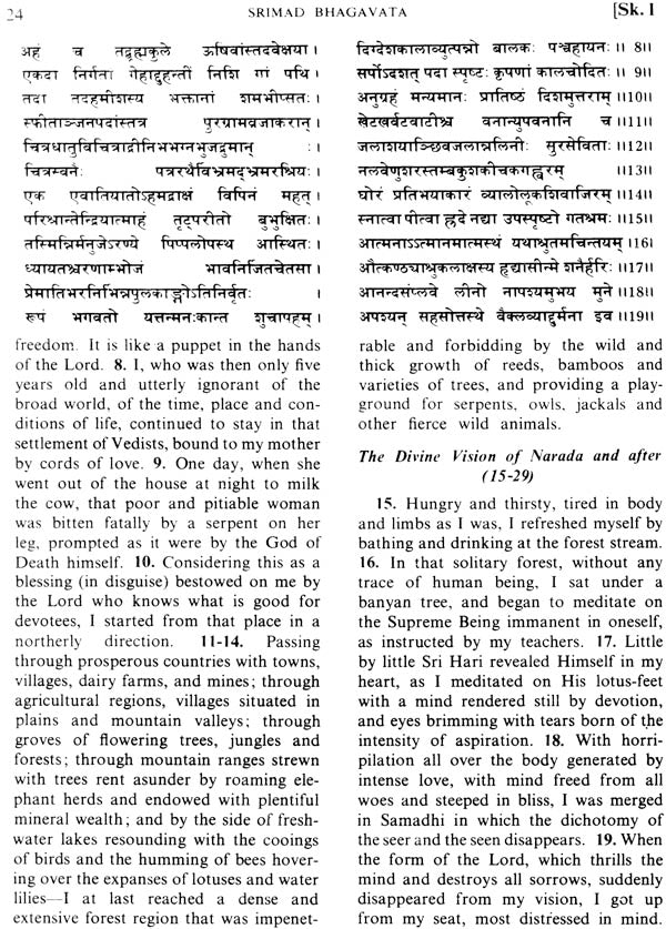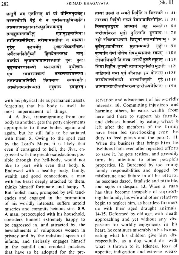 The Bhagavata, according to orthodox calculations, is supposed to contain eighteen thousand verses, but on actual counting, one will find only about fourteen thousand and odd passages, including prose sections and verses. This difference is caused because the numerous long prose passages of the Text are counted as forming a verse for every thirty-eight letters in the orthodox way of calculation. The colophons are also counted. The whole Text is divided into four volumes- the first comprising Skandhas one to four; the second, five to nine; the third, ten; and the fourth, eleven and twelve. The translation is done verse by verse, and the corresponding number of the original verses is given to their English Prose translation. The Sanskrit original is given in the upper half of the page and the corresponding translation in the lower half. Diacritical marks are not used for Sanskrit expressions, except to distinguish the long 'a' in some unusual names. Quotations are also largely eliminated because there are too many interlocutors.