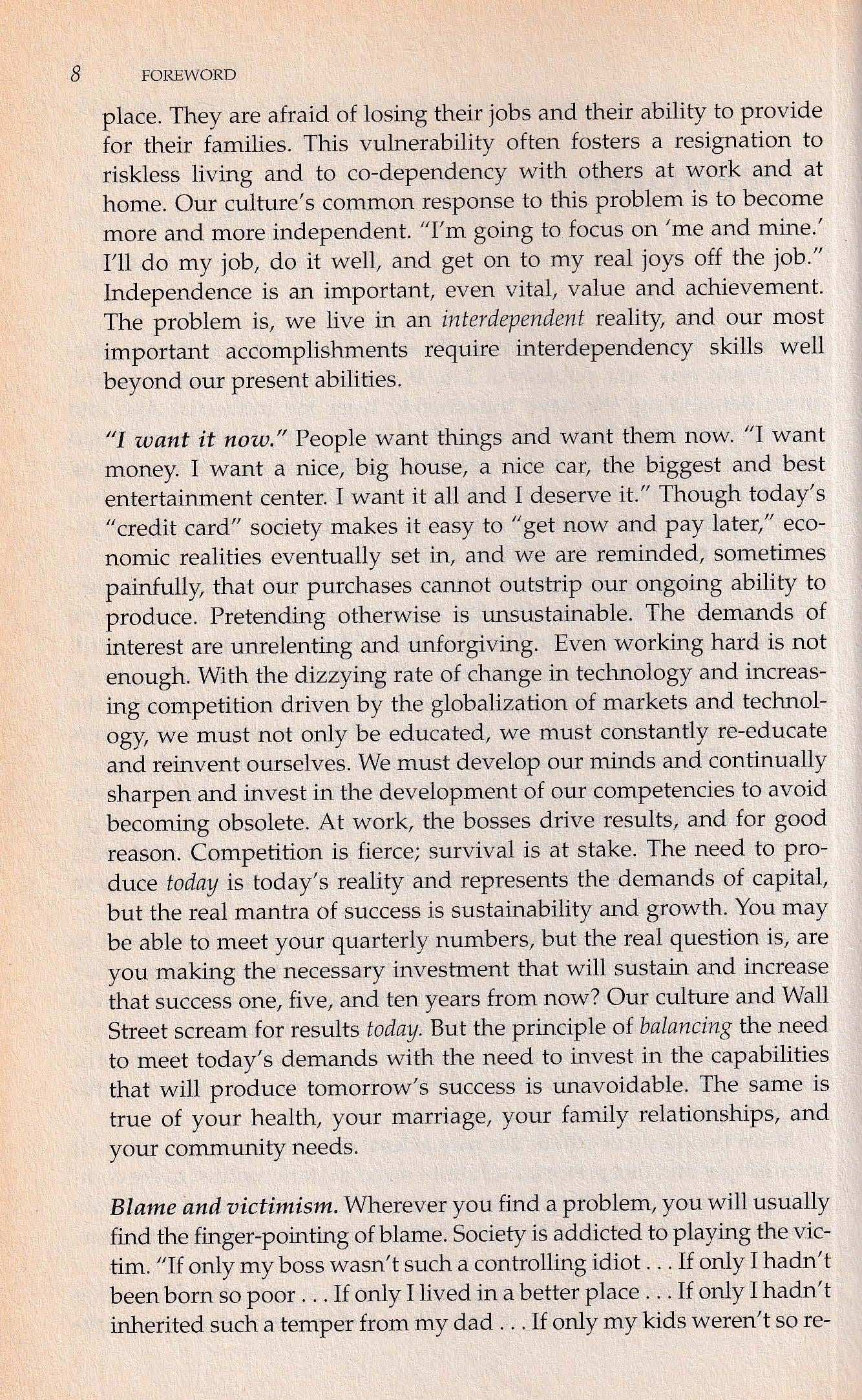 The author continues to take the readers through the journey of character development. He elaborates how the development of the character of a being ranges from the time of his birth to the years until he grows independent. The first three habits demark the development one goes from dependence to independence. The next three habits describe in detail about interdependence while the final seventh habit deals with the new self, that is renewal.