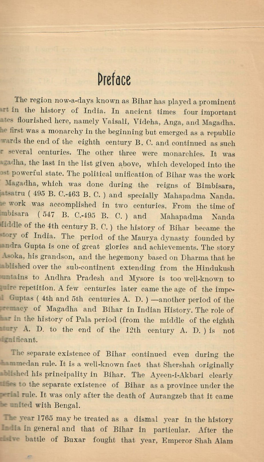 The region now-a-days known as Bihar has played a prominent art in the history of India. In ancient times four important ates flourished here, namely Vaisali, Videha, Anga, and Magadha. The first was a monarchy in the beginning but emerged as a republic wards the end of the eighth century B. C. and continued as such several centuries. The other three were monarchies. It was agadha, the last in the list given above, which developed into the ost powerful state. The political unification of Bihar was the work Magadha, which was done during the reigns of Bimbisara, atsatru (495 B. C.-463 B. C.) and specially Mahapadma Nanda. e work was accomplished in two centuries. From the time of mbisara (547 В. С.-495 В. С.) and Mahapadma Nanda Middle of the 4th century B. C.) the history of Bihar became the story of India. The period of the Maurya dynasty founded by andra Gupta is one of great glories and achievements. The story Asoka, his grandson, and the hegemony based on Dharma that he ablished over the sub-continent extending from the Hindukush untains to Andhra Pradesh and Mysore is too well-known to aire repetition. A few centuries later came the age of the impe-Guptas (4th and 5th centuries A. D.) -another period of the remacy of Magadha and Bihar in Indian History. The role of har in the history of Pala period (from the middle of the eighth ury A. D. to the end of the 12th century A. D.) is not ignificant.