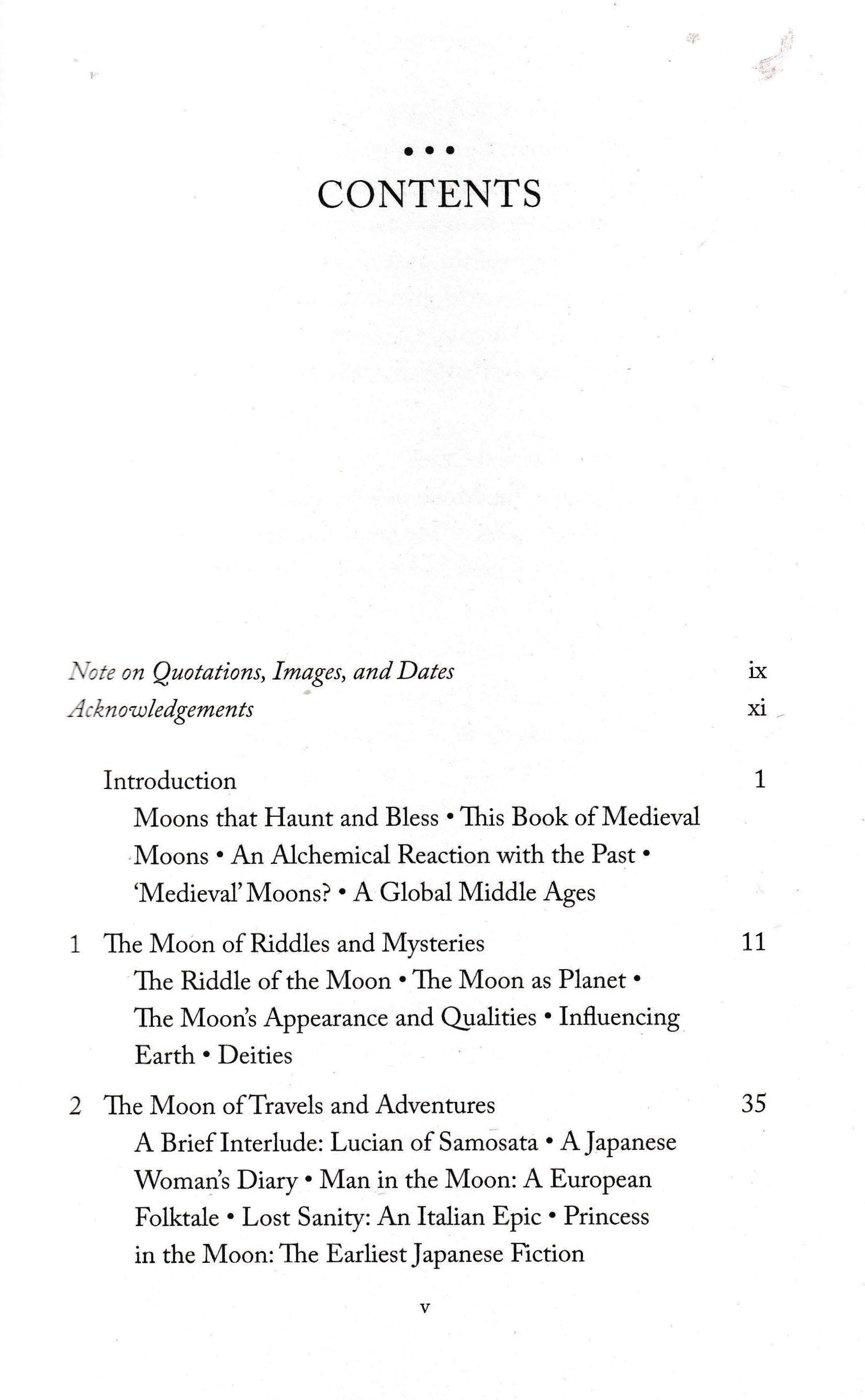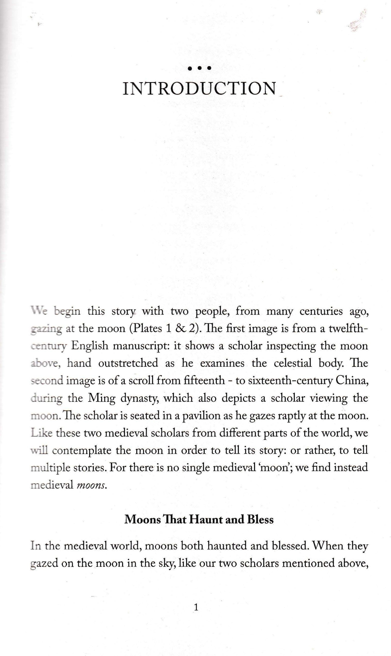 When they gazed at the moon, medieval people around the globe saw an object that was at once powerful and fragile, distant and intimate. The moon could convey love. beauty, and gentleness; but it could also suggest pain, hatred, and violence. In its circularity the moon was associated with fullness and fertility. Yet in its crescent and other shifting forms, the moon could seem broken, even wounded.