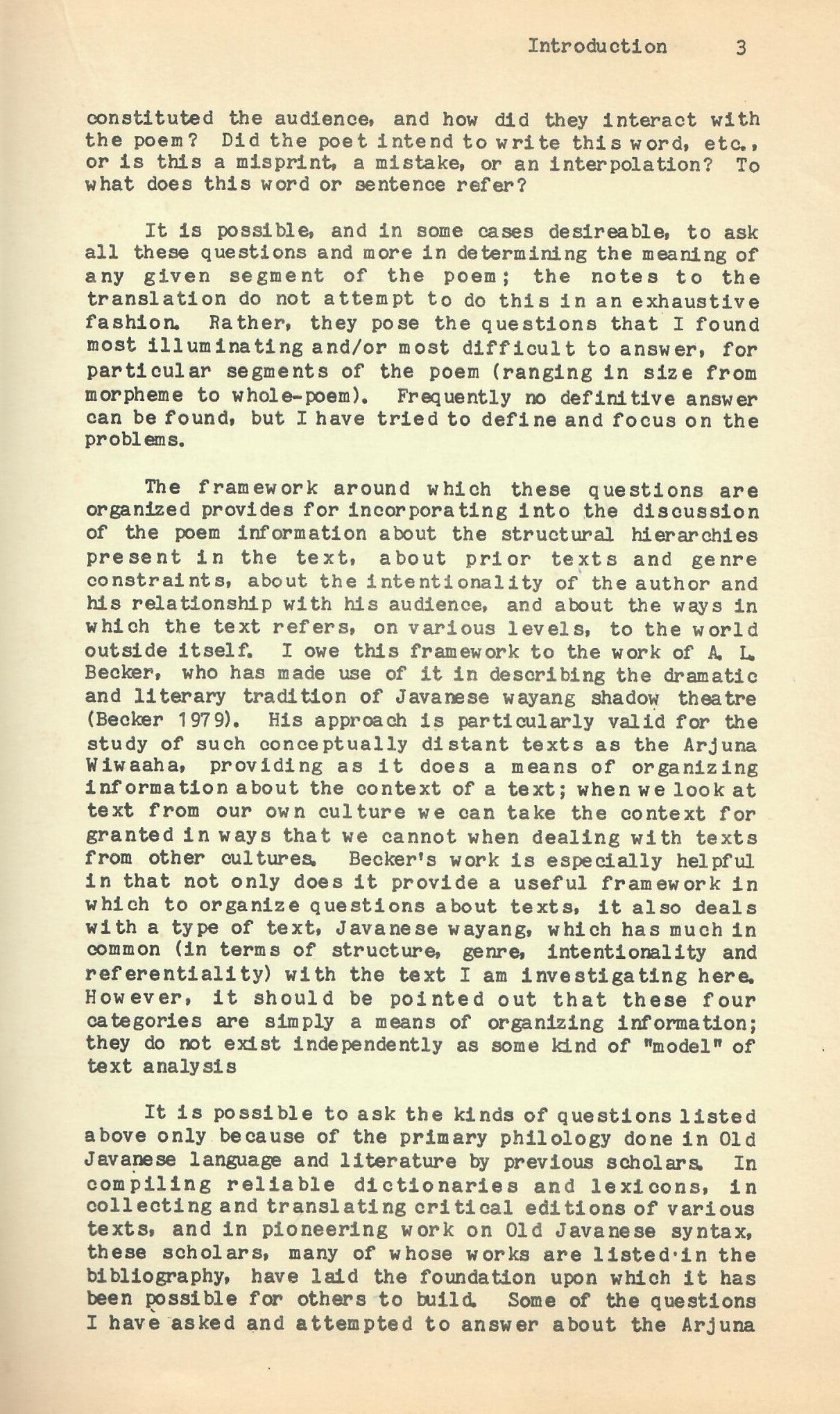 Accompanying the translation is a set of notes in which I deal, on a case by case basis, with various difficulties in translation and interpretation, and also with particular points of interest regarding Old Javanese language and literature, In organizing the work in this way, my goal has been to keep the poem as central as possible; the notes are mainly a means of contextualizing the poem, not an explication of Old Javanese language or literature per se.
